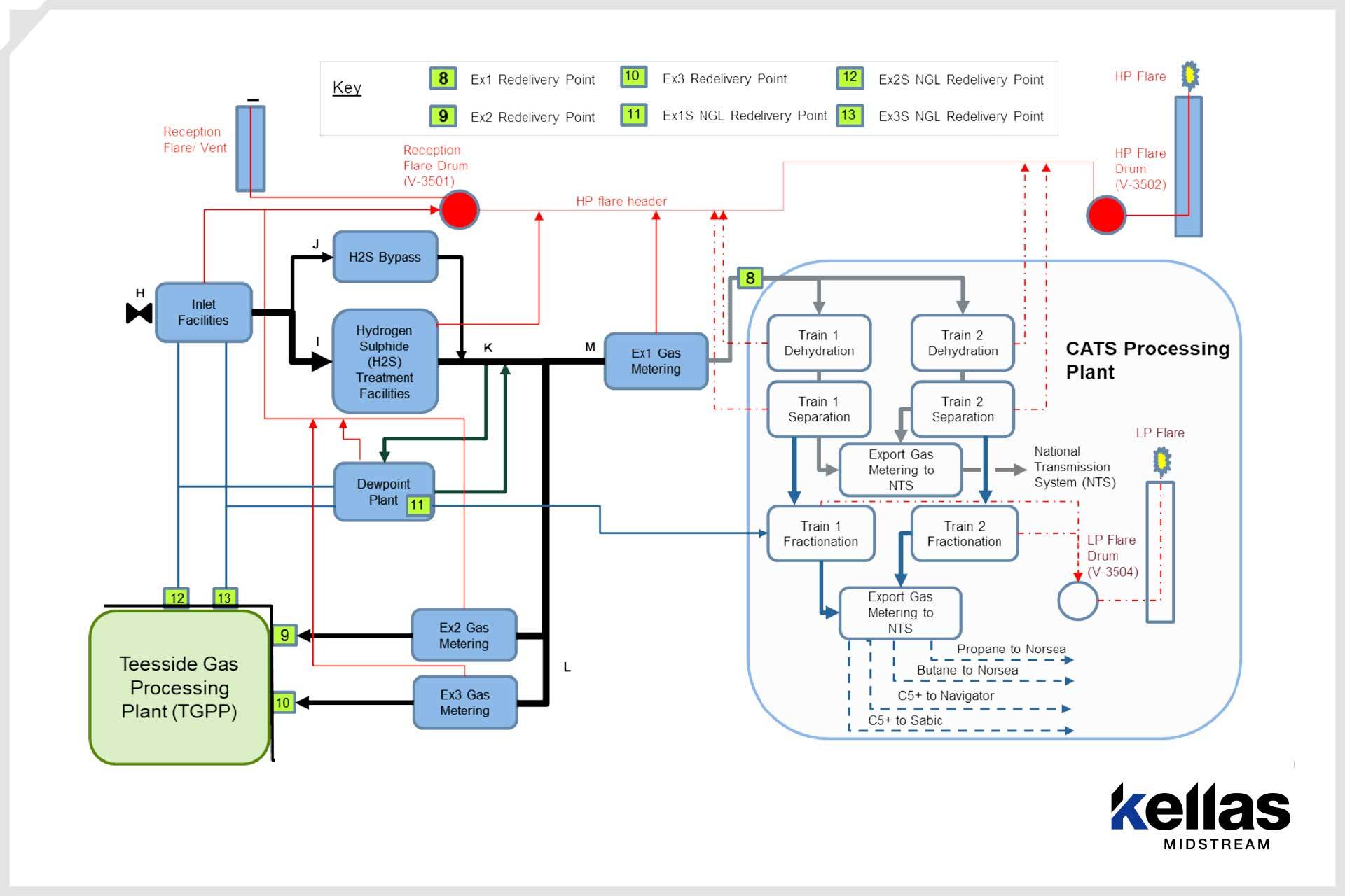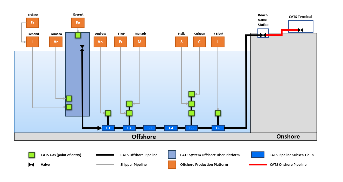CATS delivers gas directly into the National Transmission System, with liquid products (propane, butane, and a mixed condensate C5+ stream) exported via pipelines to nearby third-party facilities for sale or storage and loading.
